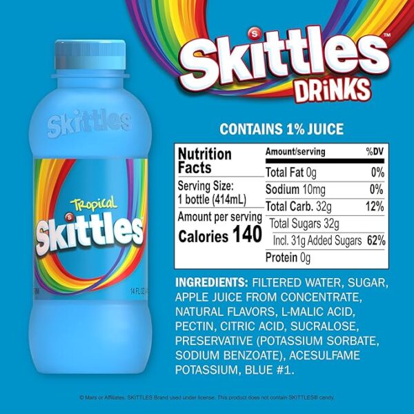 scape to a tropical paradise with Skittles Juice Drink in our exotic Tropical flavor! Made with a blend of tropical fruit juices, this drink is a vibrant explosion of island flavors. Immerse yourself in the sweet and tangy taste of Skittles Tropical candies in a refreshing new form.