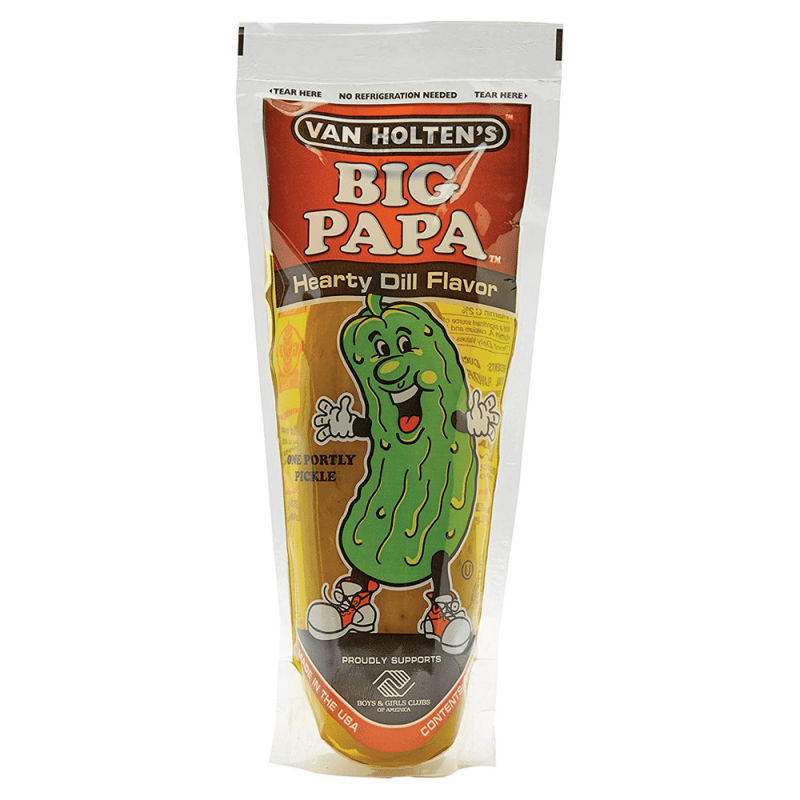 These King Size pickles from Van Holten’s are the real deal! Larger than the regular range of Jumbo pickles, this “Portly” Big Papa Dill pickle is the leader in the clubhouse. Full of hearty dill flavour, you can find the big guy practically everywhere – from truck stops to movie theatres – wherever the real action is! Van Holten’s pickles come in a handy, securely sealed pouch and don’t need refrigerating making them perfect for on-the-go snacking. This low-calorie, fat-free snack is made from gluten-free ingredients.
